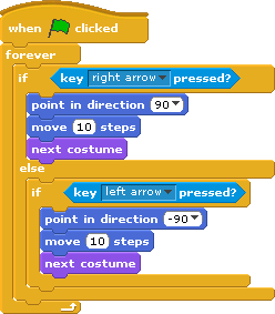 Next we will create a loop that runs forever once the Green Flag is clicked. Inside the loop we create a conditional if statement that determines whether or not the right or left arrow has been pressed and executes actions accordingly: