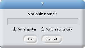 Variables are named symbols that can store data. In some languages you are required to specify a type for a variable before you store data in it. A type determines whether the variable can hold a number, string, boolean value, etc. Scratch, however, is a weakly typed language. This means that the variable type does not have to be specified. To create a new variable, click on the Variables tab and then on the "Make a variable" button.