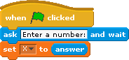 The "answer" block will contain the result of this query when the program is run. Let's store answer in the variable X. To do this, go to the variables tab and attach the "set X" block to the last command in the Script. Now go back to "Sensing" and drop the "answer" block into the operand box of "set X":