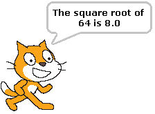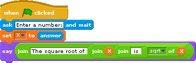 Take the square root of the answer and return it on the screen with the text "The square root of " write the number here using join " is " write the square root here using join. Note that you need three nested joins for this and the "say" block in Looks: