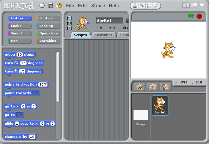 For now, let's focus only on the far left and far right panels (ignore the center). The left panel is where you will find all of the basic programming constructs which in Scratch are called blocks. Most of these are commands that you can send to Scratch. We'll explain what the rest are in the second chapter. The right panel contains the Stage which is where all the action occurs. You will notice that on the Stage there is something called a Sprite. A Sprite is simply a 2-dimensional image usually with a transparent background. In this chapter, we will become familiar with the commands in Scratch and at the end of the chapter we will write our first program.