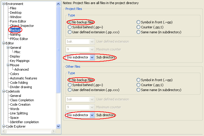 5. To test your Lazarus installation, open the folder GettingStarted in Unit 1 of the Introduction_to_Computer_Programming directory. Double click on either GettingStarted.lpr or GettingStarted.lpi (both do the same thing). The first thing you probably want to do is change some of the environment options. Automatic backup files are optional but often get in the way so we can stop automatic backups by selecting Environment -> Options on the main menu. The window that opens should look something like the window below. You should select Backup under Environment. On both the project files and other files sections you should change the value from backup to (no subdirectory) and the type from User defined to No backup files.