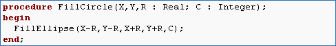 1. Define a procedure that draws a filled of some color C circle given coordinates X and Y and radius R. You will of course need to start with the graphical app template code in order to test your procedure.