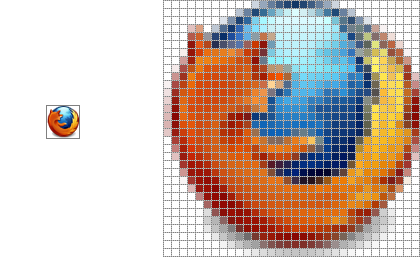 Before moving forward with graphics, we should discuss some basics about how we generate graphics at the hardware level so you can truly understand what is going on. To begin with, there are two types of graphics: raster and vector. 2D Raster graphics consists of a 2-dimensional addressible matrix of color values. The smallest element of this matrix is known as a pixel. A pixel can be only one color. The following image is an example of a raster graphic with an enlarged version shown on the right with a grid to highlight the discrete pixels of the image. Notice that the pixels never contain more than a single color.
