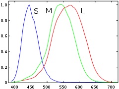 Due to the wiring of the brain, stimulation of short wavelength cones produces the perception of blueish hues (A hue is the shade of a color. Though red and maroon are different colors, they have the same hue. They differ only in brightness). Stimulation of medium wavelength cones corresponds to yellowish-green hues and stimulation of long wavelength cones corresponds to reddish hues. The reason we say blueish and reddish instead of blue and red is because cones respond to ranges of hues and not just distinct hues. Looking at the chart above you can see that if light with a wavelength of 700nm falls on the retina (part of the eye that detects light), long wavelength cones will be stimulated with almost no stimulation of short or medium cones. However, what happens with light of 600nm? Both long and medium cones are stimulated. Or with 450nm short cones are predominately stimulated but long and medium cones are stimulated to a lesser extent as well. If multiple cones are stimulated, they compete. This competition yields the range of thousands of different hues we detect. The full visible spectrum in the figure above is the result of these hues. For example, you can see how the brain produces yellow by interpolating between red and green. You can also see why we say white light is a combination of all colors: if all of the cones are equally stimulated, the brain interprets the color as white.