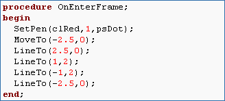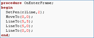 We can use SetPen(clLime,2) and then a single call to MoveTo(0,0) followed by three LineTo's (don't forget to close the bottom of the triangle with a LineTo back to (0,0)). You can use Ctrl+G to toggle the grid and see that the triangle is at the correct location.