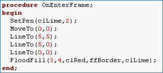 Use the triangle code from the exercises above. After the triangle is drawn, pick any coordinate inside the triangle as the initial FloodFill point. We'll use (4,3). The border of the triangle is clLime so we can use that as the ControlColor if FillType is ffBorder. The FillColor is of course clRed.