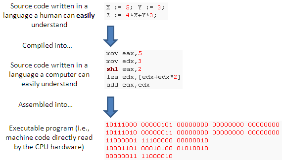 Programming is the process of designing a sequence of instructions to be interpreted and executed by some processing unit. The rules and symbols that represent valid instructions are known as a programming language, and any file containing these symbols is known as source code. Machine-readable instructions are generated from human-readable source code by software known as a compiler. The sequence of machine-readable instructions is known as the program or more generally the application.