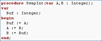 Using the pseudocode from above, write a procedure in Object Pascal that swaps two integer variables.