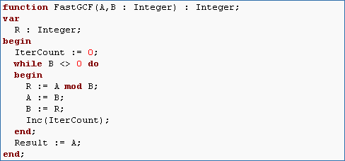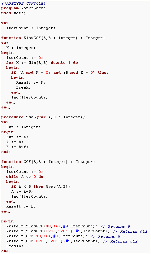 Implement the pseudocode from the previous problem in Object Pascal as a function called FastGCF. Include an iteration counter and then compare all three algorithms with 40 and 16 as well as 8704 and 22016.