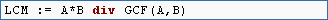 The reason we cannot multiply 10 and 15 and say that 150 is the lcm is that 5 is a common factor. The solution then is to eliminate the common factors of the two numbers by dividing by the gcf. Since we know that two numbers are always evenly divisible by their gcf's, we can use the div operator in Object Pascal for integer division since this is more efficient than floating point division: