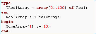 An array type declares that a variable or constant can hold multiple values. So arrays are like lists. Generally the elements (individual values) of an array are typed (i.e., an array that holds integers must be declared as such), but there are some cases in which an array can be untyped. Also, in most cases the bounds, or start and stop index, of an array must also be specified. The bounds of an array can be any valid subrange. The following is the most basic example of declaring an array: