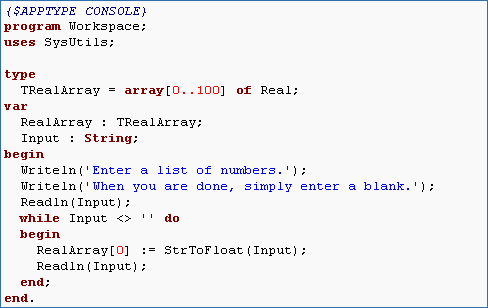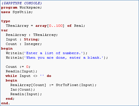 Write a program that reads in a series of numbers until the user enters a blank. Since we are dealing with blanks, you will need to read the number in using Readln as a string and then convert it to a number using StrToFloat from SysUtils. When you convert the number store it in RealArray[0]. This will of course overwrite the first entry in the array on each iteration of the loop, but we will worry about this in the next problem.