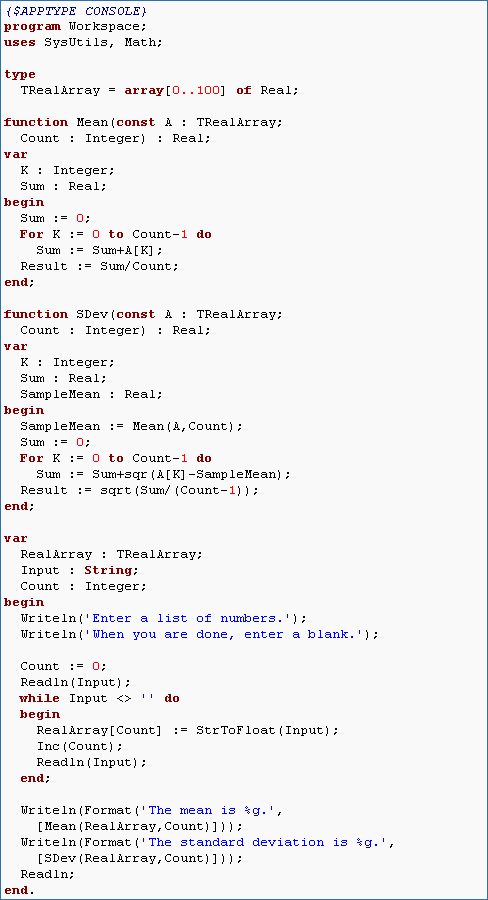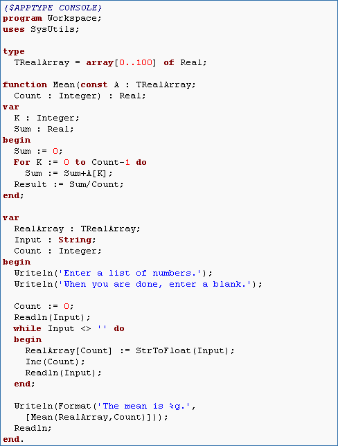 Now write a function called Mean that takes a TRealArray argument and an Integer that specifies the number of values in the array (i.e. the count) and computes the mean of the array. Keep in mind that TRealArray is huge (it contains 101 reals). That means we should pass it by reference using the const directive. (We would use var if we wanted to modify the array, but in this case we don't.) Output the mean to the screen.