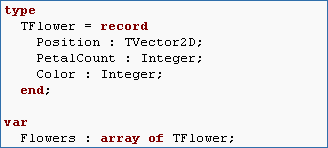 Position is declared as a TVector2D since we want X and Y coordinates. PetalCount is an integer because we will never have a fraction of a petal. Color is an integer because colors are always 32-bit integers.