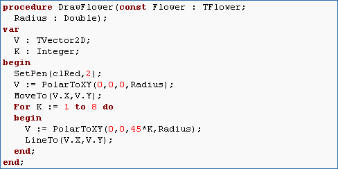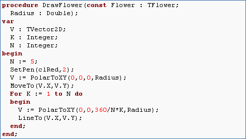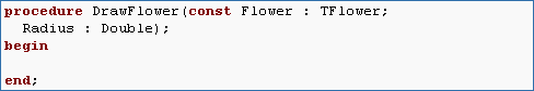 We declare Flower with the const directive to pass Flower by reference. We do this because we don't want the entire record copied in memory when we call DrawFlower. We only want the reference to its address in memory. Radius is simply declared as a real variable.
