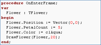 Call DrawFlower (even though we haven't implemented it yet) inside of OnEnterFrame. You'll need to create an instance of TFlower locally in order to do so. Initialize this instance to be positioned at the origin, to have 5 petals, and to be any color you like. The radius passed to DrawFlower should be about 5. The reason we are doing this is so that we can easily debug DrawFlower as we are writing it.