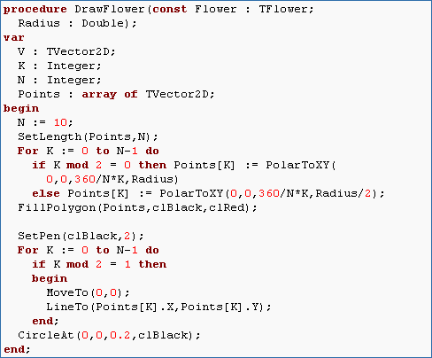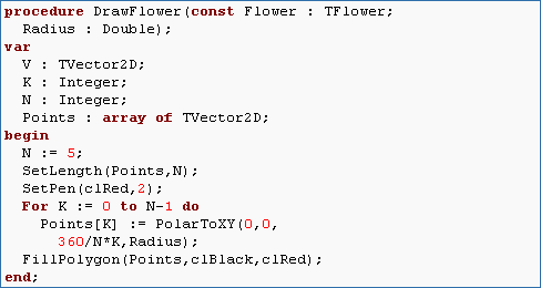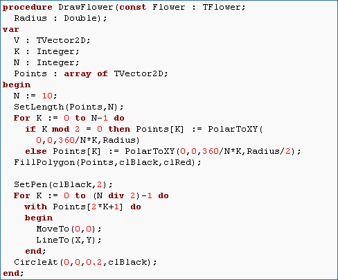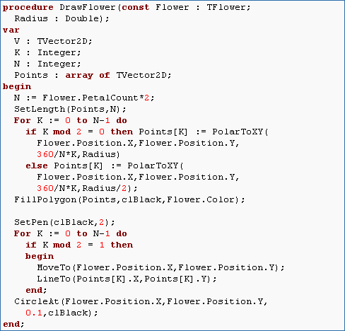 Now define a procedure that draws a flower given an instance of TFlower. Don't implement the procedure yet, just define the header (i.e. procedure DrawFlower(...)). This procedure will take 2 arguments: Flower and Radius (the latter will be used for the "bloom" effect).