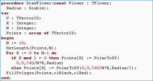 Instead of using MoveTo-LineTo statements. Let's draw a filled regular polygon with one call to FillPolygon(Points,LineColor,FillColor). In order to do this we need an array of points. We can get such an array by declaring a dynamic array Points and then using SetLength(ArrayName,Size) to set the size of the array where size is the number of vertices. We then use a similar loop in which we define the coordinates of each vertex using Points[K].
