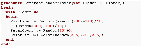 Let's create a function called GenerateRandomFlower that will fill an instance of TFlower with random initialization values. GenerateRandomFlower should take 1 argument (Flower) passed by reference. Remember that we want to modify the values of Flower inside the procedure so we cannot use the const directive to pass it by reference (what should we use?). You can use the Random(UpperBound) procedure which generates a random integer from 0 to UpperBound-1. The position should be somewhere within the screen bounds (i.e., between -14 and 14 on X and -10 and 10 on Y). Remember that to position between two bounds such as -14 and 14 you can do something like Random(28)-14. If you want coordinates such as 12.3 to be included you can do (Random(280)-140)/10. The flowers can have any number of petals that you want as long as it is at least 3. The color should be chosen with HSI2Color where Hue is Random(255). Use full saturation and full intensity.