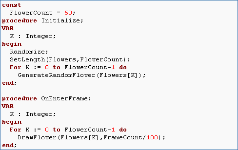 Let's generate 50 flowers randomly on the screen. We'll initialize all the flowers in Initialize. First, you should declare a global constant (it will be used by other OnEnterFrame so it must be global) called FlowerCount set to 50. Inside of Initialize, set the length of the dynamic array to FlowerCount. Then simply loop trhough every entry in Flowers (0 to FlowerCount-1) and call GenerateRandomFlower. You will then need to go to OnEnterFrame and again loop through every entry in Flowers and call DrawFlower(Flowers[K],FrameCount/100). Don't forget to call Randomize inside of Initialize in order to reset the random number generator.