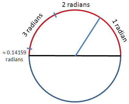 As we saw above, an angle measuring 1 radian subtends only part of the circumfrence of a circle. How many radians must an angle be to cover exactly half the circle? Hint: What is the formula for the circumference of the circle given its radius?