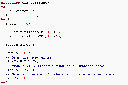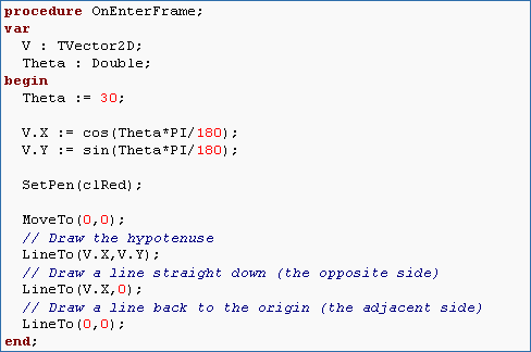 Given that the functions "sin" and "cos" in ObjectPascal expect angles in radians, if we want to pass something in degrees we have to multiply the degree value by PI/180 to convert to radians. Using this, write a program that draws a right triangle with a hypotenuse length of 1 and an angle with the x-axis of 30 degrees. Hint: You'll need MoveTo and LineTo and you'll have to calculate the X and Y coordinates of the far end of the hypotenuse using sin and cos.