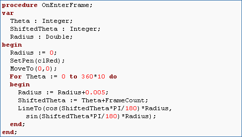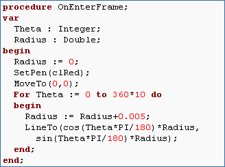 The only difference between a spiral and a circle is that in a spiral the radius is not constant. So declare the radius as a variable of type Double. Now make a begin-end block in the loop so that we can increment the Radius on each step by a small amount. How small depends on how big you want the spiral. 0.005 does a good job. Also, don't forget to initialize the Radius to 0. And of course, the spiral starts at the origin so MoveTo should be MoveTo(0,0).