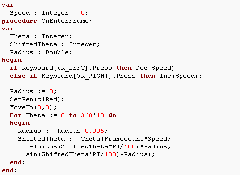 Make the rotation of the spiral speed up or slow down based on pressing the right or left arrow keys. Hint: Create a variable called Speed and vary it using the Keyboard[VK_LEFT].Press and Keyboard[VK_RIGHT].Press key states.