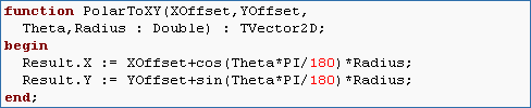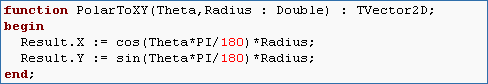 Cartesian coordinates. So our function will be called PolarToXY and it should take in arguments Theta and Radius and return a TVector2D of X and Y coordinates. Hint: If you have a circle of radius 5, how to you determine the X and Y coordinates of a point that is 30 degrees from the x-axis.