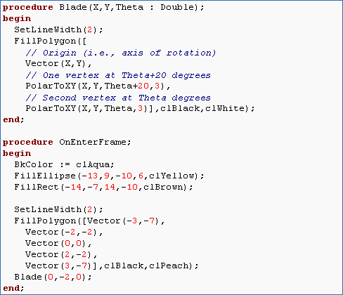 but this is completely dependent on how wide you want the blades to be. The length can be about 3, but you could make them longer or shorter. This procedure will need to take in arguments X, Y, and Theta to determine the position (corresponding to the axis of rotation) and current location on the circle of the blade. Call the procedure inside of OnEnterFrame in order to test it until you get it to do what you want. Hint: You can use PolarToXY to determine the coordinates and FillPolygon to draw the blade.