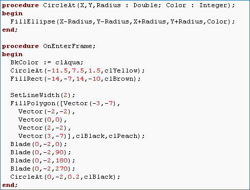 We want to first add the body of a windmill to the scene. To do this, run the program to display the scene and press Ctrl+G to view the grid. Then copy the scene to the clipboard using Ctrl+C. Now you can open your preferred drawing program and paste the image (often using Ctrl+V or selecting Edit -> Paste from the menu). We suggest using something like MS Paint on Windows or GIMP on Mac/Linux. In an external drawing program you can draw any structure and then use the grid to determine the coordinates you will need to use for programming. Using this technique, draw the body of a windmill (not the blades) using the FillPolygon function. Remember that the syntax of FillPolygon is something like FillPolygon([Vector(0,0),Vector(10,10),...],clBlack,clBrown) where black is the outline color and brown is the fill color.