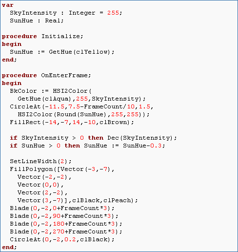 Next we have SunHue. SunHue is defined as a real because decrementing in integer increments makes the sun turn red too quickly. We need to decrement in fractional increments. For the color of the circle, we use HSI2Color(Round(SunHue),255,255)) because we want full saturation and full intensity (the sun doesn't go out as it sets it just changes hue). We have to use the Round function because HSI2Color expects to receive an integer argument. So if the SunHue is 20.4, we just pass 20 to HSI2Color. Finally, we decrement SunHue by 0.3 each time (you can do it faster or slower if you like) until it reaches 0.