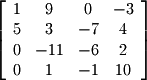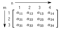 Matrices are another fundamental concept to linear algebra. A matrix is a rectangular table of entries. The notation for a matrix is generally a bold-faced capital letter such as . Matrices in introductory linear algebra generally have 2 dimensions. The notation for the size of a matrix is (pronounced by ) where is the number of horizontal rows and is the number of vertical columns. For example, the matrix shown in Figure 1-9 has 3 horizontal rows and 4 vertical columns.